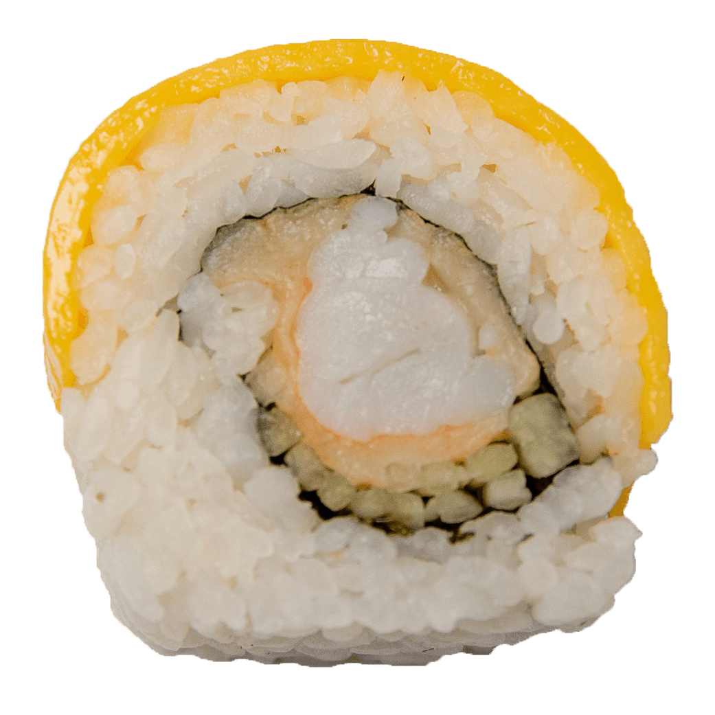 Roll con camarón tempura, pepino, arroz blanco y masago por fuera, 10 bocados.