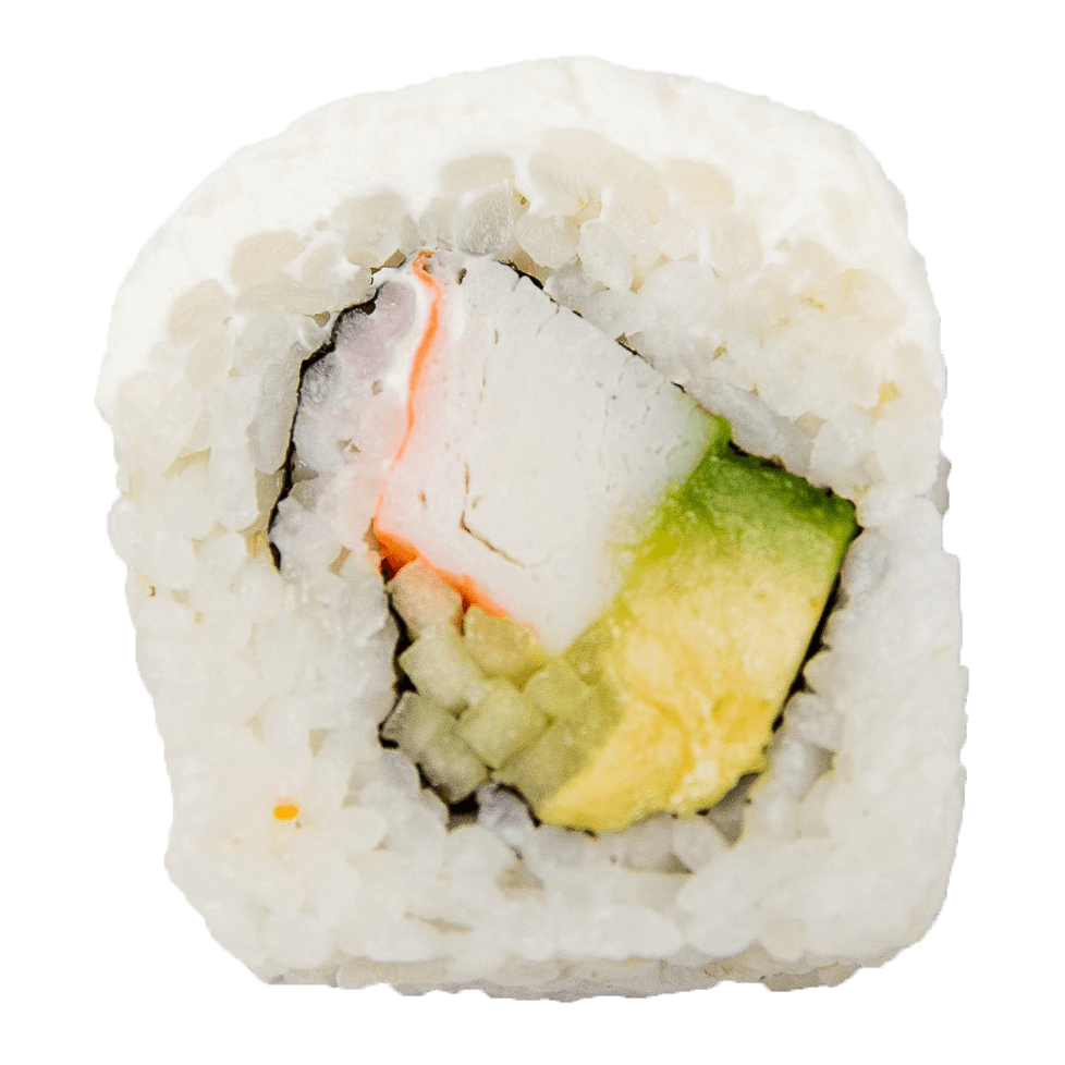 Roll con surimi, aguacate, pepino, arroz y queso crema por fuera, 10 bocados.