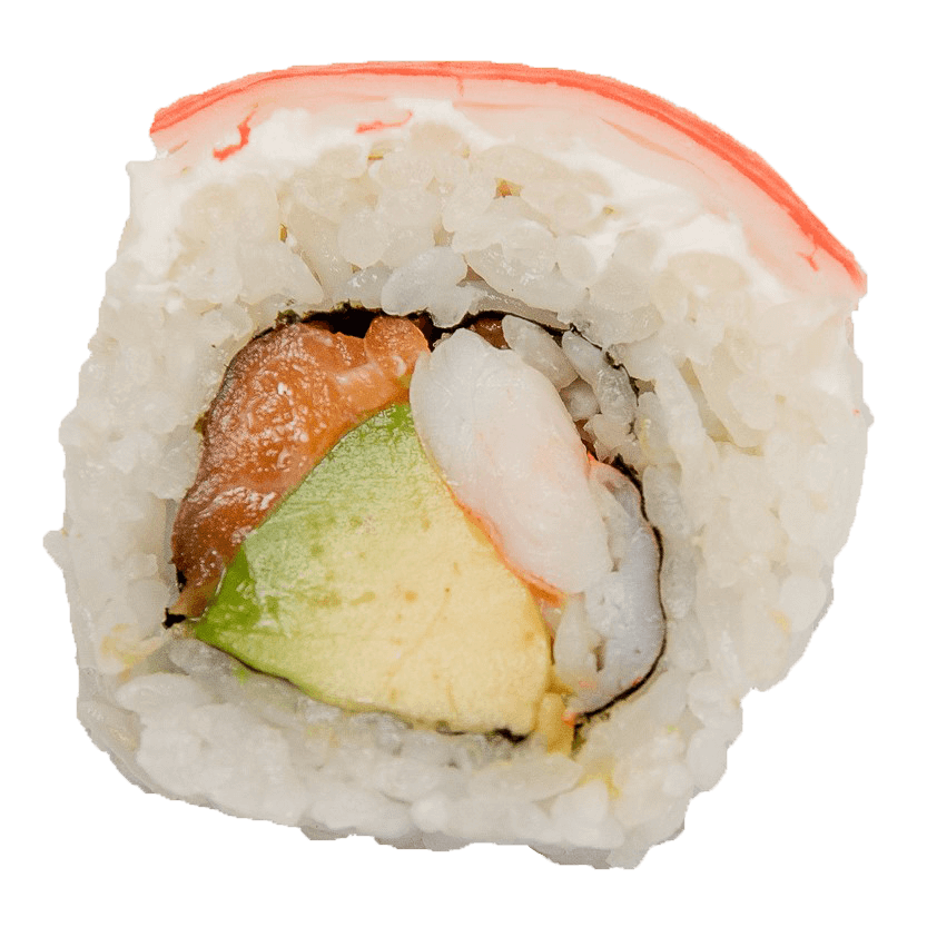 Roll con camarón, salmón, queso crema, aguacate y kanikama por fuera, 10 bocados.
