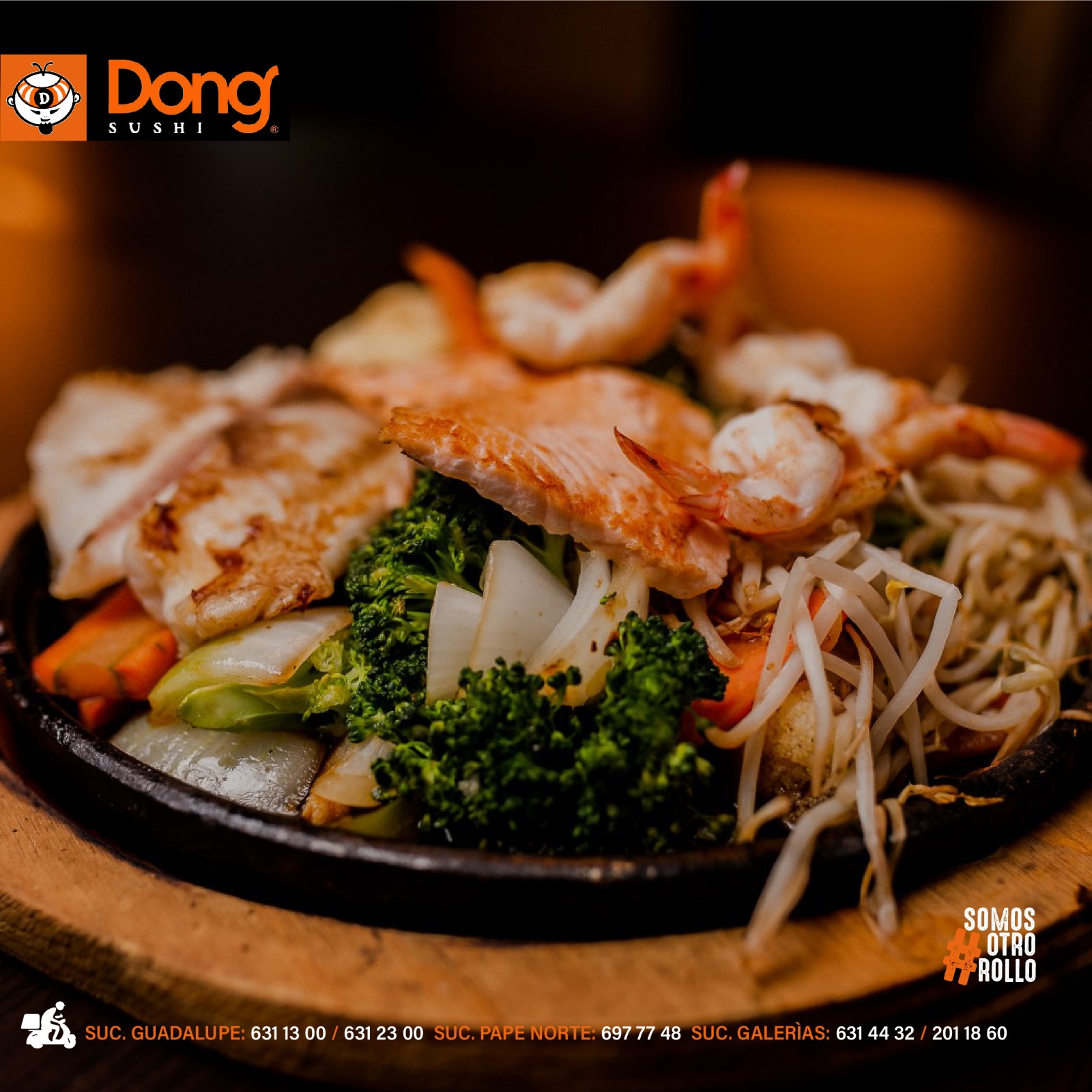 Teppanyaki con brócoli, zanahoria, germen de trigo, camarón, salmón, filete de pescado, arroz frito y salsa a elegir.