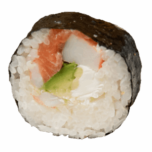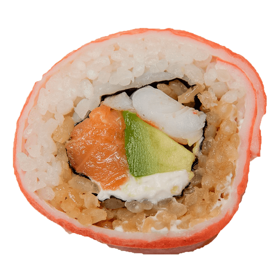 Roll con salmón, camarón, queso crema, aguacate, arroz blanco, arroz frito y surimi por fuera, 10 bocados.