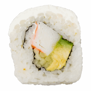 Roll con salmón, camarón, queso crema, aguacate, arroz blanco, arroz frito y surimi por fuera, 10 bocados.