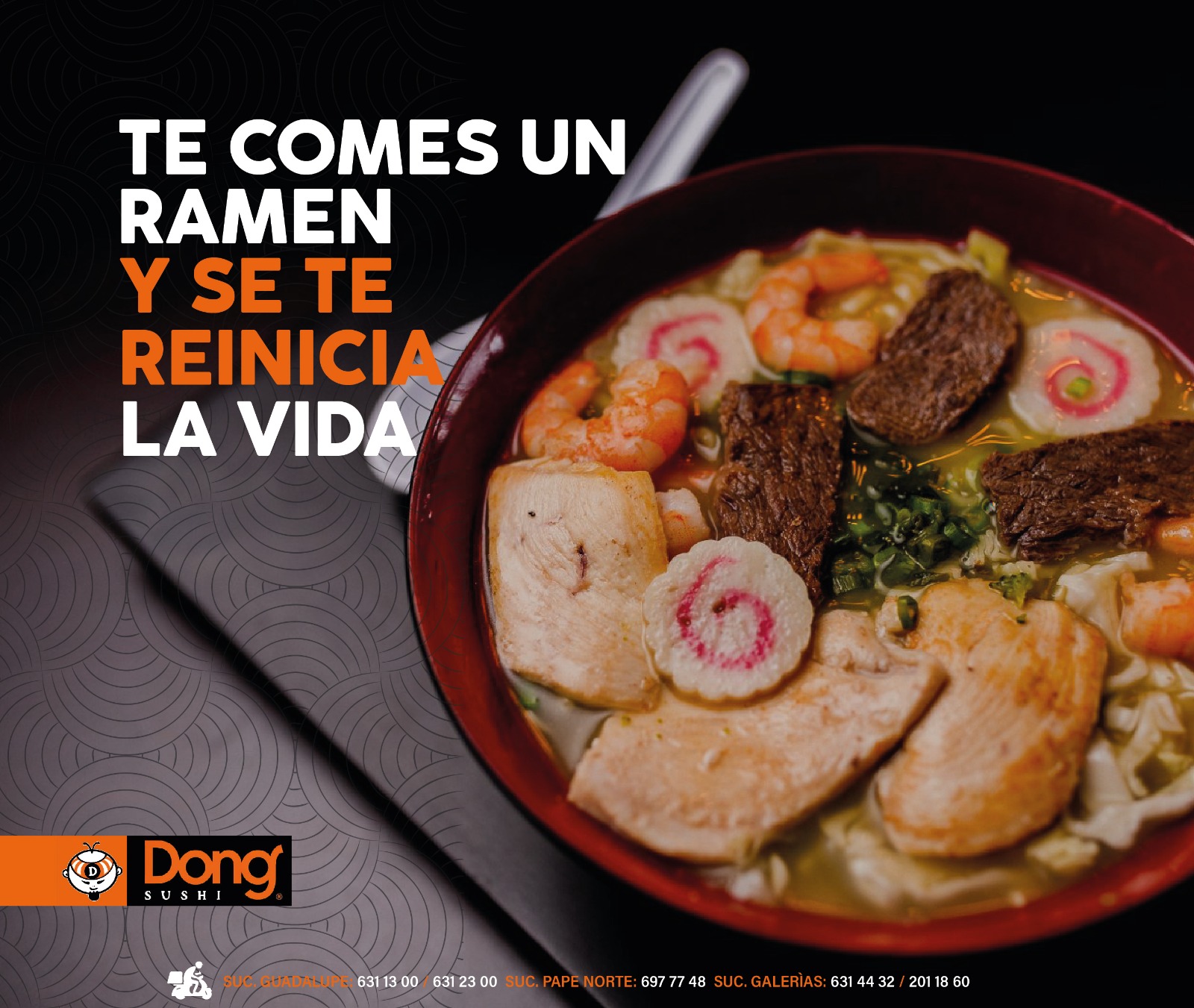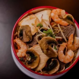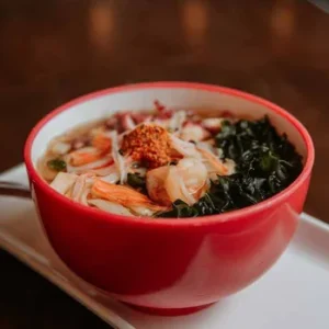 Sopa de fideos chinos con carne de res, pollo, huevo y cebollín.