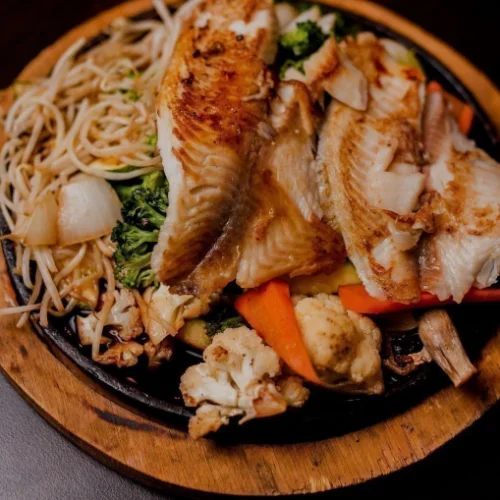 Teppanyaki con brócoli, zanahoria, germen de trigo, filete de pescado y salsa a elegir.