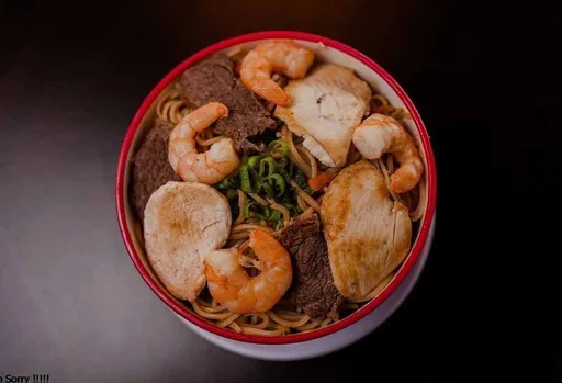 Sopa de fideos con brócoli, zanahoria, calabacín, camarones y pollo.